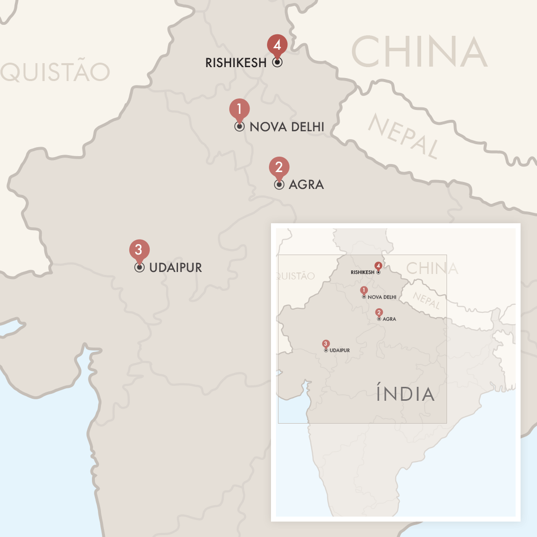 Serão 14 dias/13 noites visitando Nova Delhi, Agra, Udaipur e Rishikesh.
