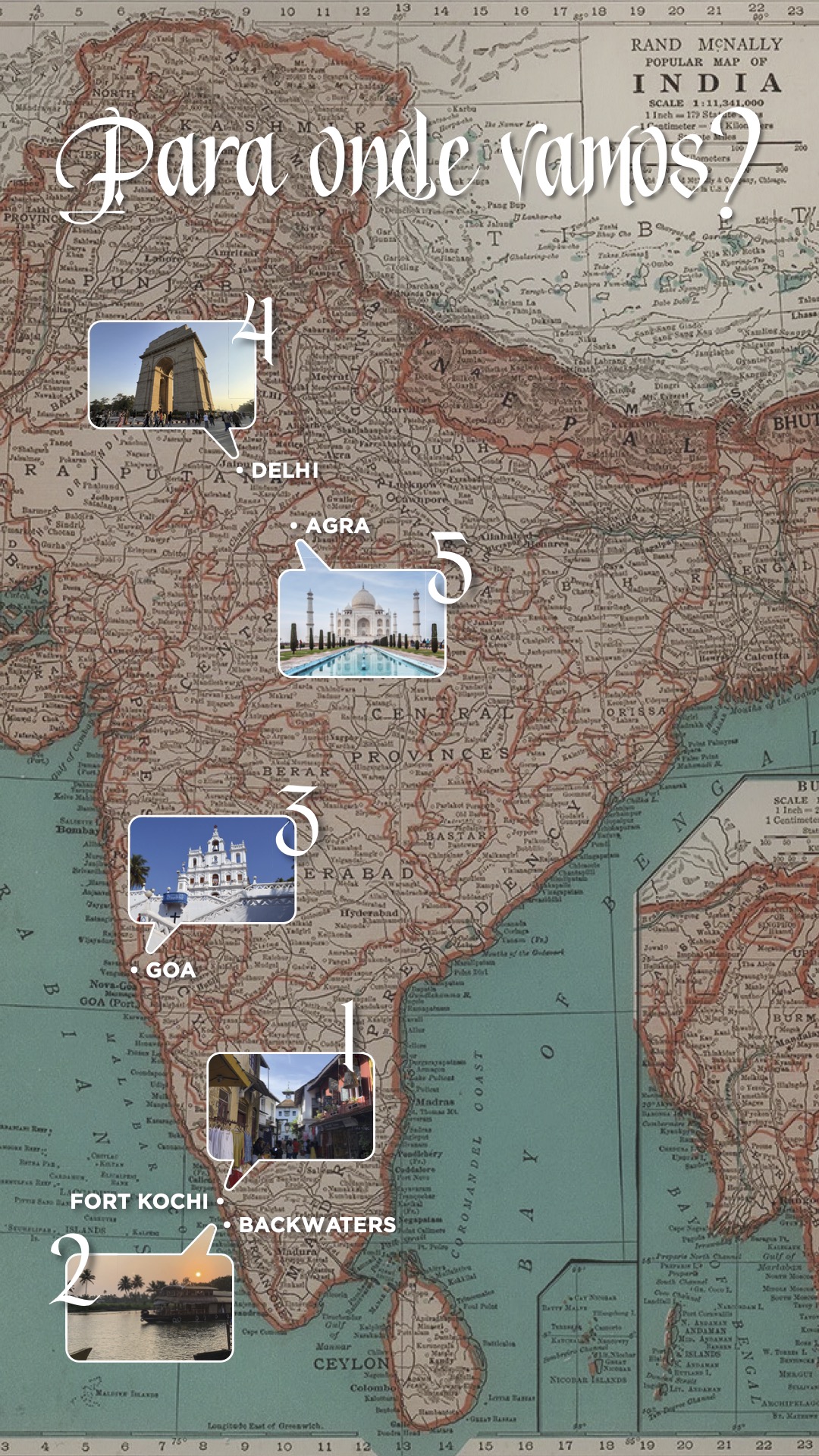 Fort Kochi, Alleppey, Goa, Delhi e Agra.