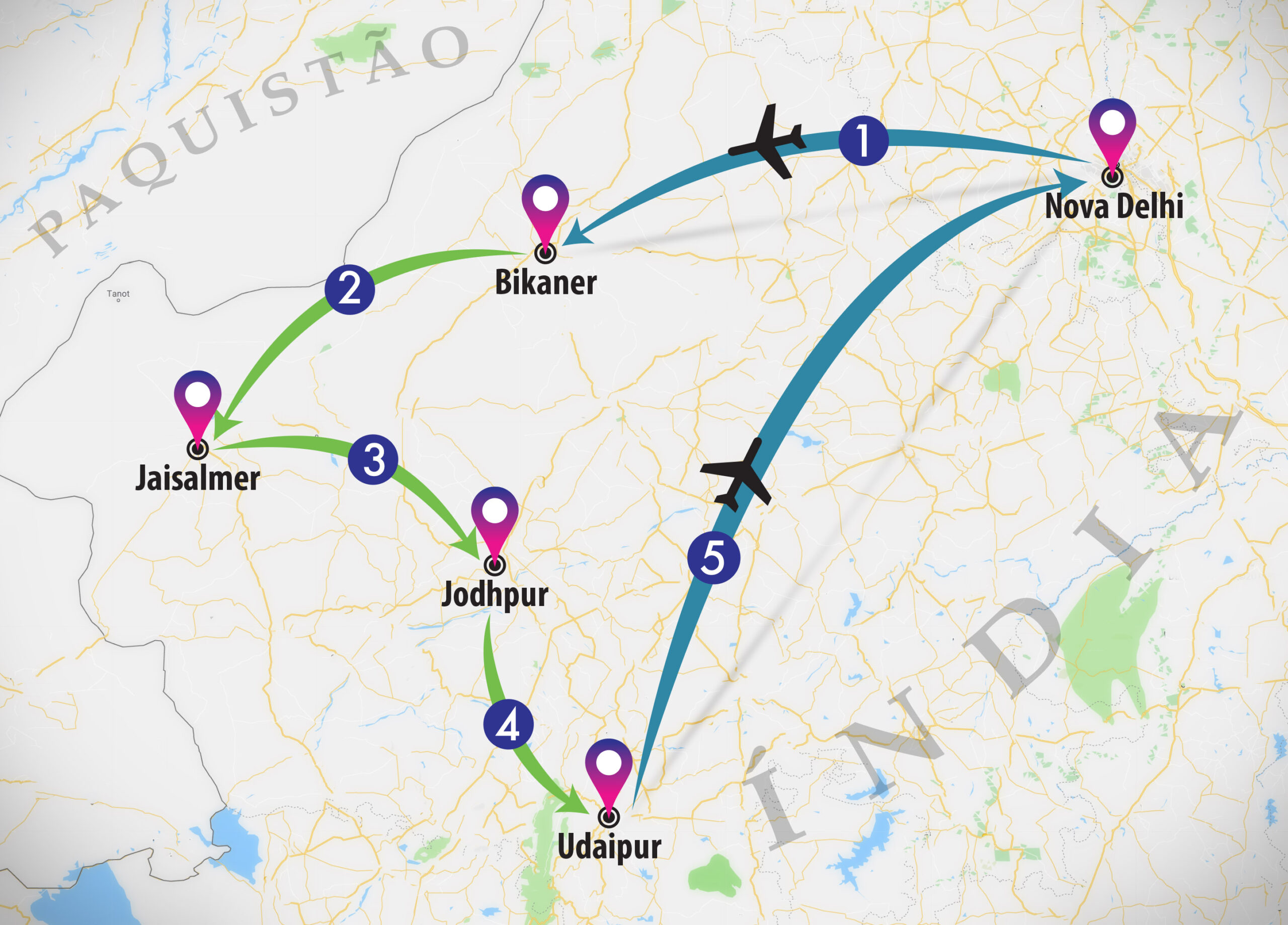 Nesta viagem nosso ponto de partida será a frenética capital Nova Delhi que é um reflexo deste país cheio de contrastes, onde vamos nos perder pelas ruelas do bairro antigo e seguir rumo a Bikaner, nossa porta de entrada para o Rajastão, uma simpática e pouco turística cidade. Depois, vamos dormir sob o céu estrelado no deserto de Thar, em Jaisalmer. Conhecer um dos fortes mais imponentes e seus fervorosos bazares, em Jodhpur. E ainda ver a explosão de cores e celebrar a chegada primavera participando do Holi, o Festival das Cores, em Udaipur.