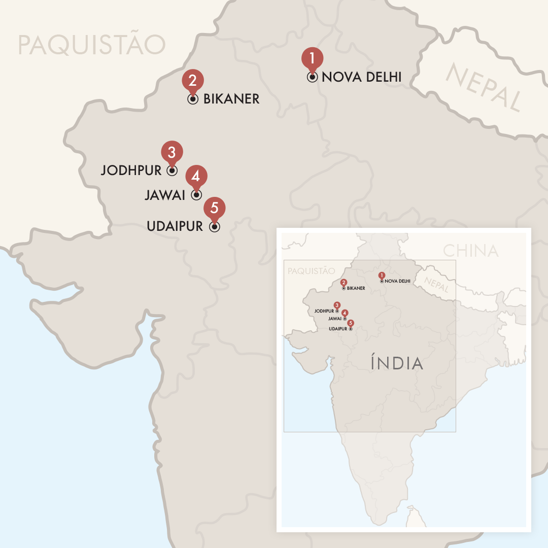 Da capital indiana Nova Délhi para a não-turística Bikaner, nossa porta de entrada para esse estado, uma cidade que um dia foi parte da rota da seda e hoje esconde em suas esquinas um povo simpático e muitas surpresas. Seguindo para Jodhpur, com seus fervorosos bazares, um forte imponente no alto da colina e seu bairro antigo com ruazinhas azuis. Uma parada para apreciar as paisagens e natureza de Jawai, uma jóia em meio ao árido estado, onde leopardos e uma zona rural habita. E pra finalizar toda beleza e poesia de Udaipur, com seus lagos, palácios e um pôr do sol que acalma qualquer mente inquieta, além de celebrarmos o Gangour Festival.